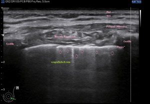 Bueno, vamos a lío. ¿La pleura se puede estudiar con ecografía?.Es una pregunta complicada, como órgano medible o cuantificable con el caliper de nuestros equipos, la respuesta es no. La imagen hiperecogénica que ves entre los arcos costales y a la que denominamos erróneamente «Pleura» deslizándose, es un artefacto especular producido por la reflexión de más o menos de un 99% de los ecos que vuelven al transductor debido a la interfase tan potente resultante de la parte blanda de la pared torácica y el aire del pulmón.