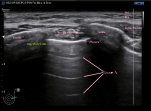 Líneas A. En la imagen 1 puedes ver la normalidad de un pulmón bien aireado en esa región explorada. La anatomía radiológica, la imagen hiperecogénica que asociamos a la pleura y los artefactos en espejo de las tres líneas A paralelas a la línea que hemos denominado «Pleura» y que tan solo es la primera de las líneas especulares, es decir, artefacto de espejo que se produce entre la pared torácica y el aire del pulmón.