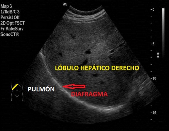 Diafragma, que es la línea hiperecogénica que separa ambos órganos.