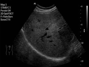 Ecográficamente es una estructura voluminosa, hiperecogénica y homogénea que no debe medir en adultos más de 12 cms. Los vasos de la estructura se verán anecoicos.