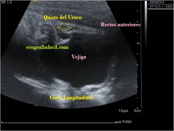 La paciente acude por molestias abdominales, la prueba discurre normalmente, pero al pasar en línea media antes de llegar a la vejiga, una imagen pequeña, ovalada, medial, anecoica ocupa la parte superior de la vejiga. Se demuestra en la primera imagen, se corrobora con la imagen 2, o corte longitudinal donde se demuestra clarísimamente su situación anatómica con respecto a la vejiga y a los tejidos circundantes.