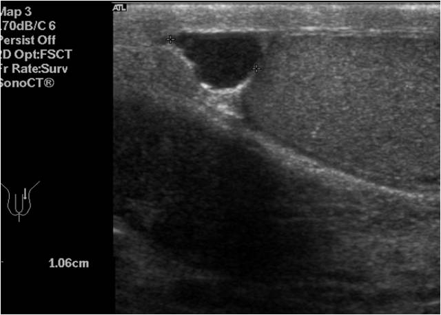 Arteria Radial, anecoica, flanqueda por dos venas, que son anecoicas, más pequeñas y depresibles.