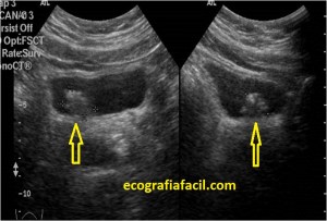 Ecográficamente aparecerá como una masa hiperecogénica, heterogénea, pegada a la pared en forma de “coliflor” que al ponerle el doppler color se puede ver como está vascularizada, esta vascularización es diagnóstica para malignidad, generalmente.
