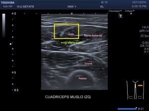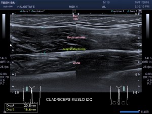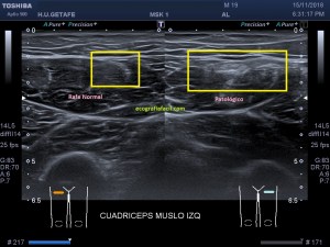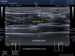 Comparing both anterior regions of the thigh, at the height of the affected region we see the caliber difference of both anterior straight. Even in image 6, the patient performs an isometric contraction where we see that the caliber difference with respect to the same image in relaxation increases, image 5.