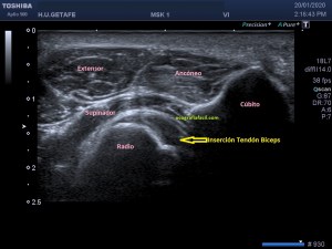 Lo que conseguimos es un corte axial de esa localización donde vemos en plano profundo el radio y más superficial el cúbito, los músculos superficiales al radio son dos,junto al cúbito vas a ver un músculo, es el ancóneo, profundo un músculo alargado, que cubre al radio, es el supinador, el más profundo deja un espacio, con el radio por el que el tendón del bíceps discurre cuando hacemos el movimiento de rotación en la muñeca y aparece en forma de pico, hiperecogénico bordeando al radio, como deslizándose por él, esta es la forma más efectiva que tenemos de visualizar el tendón del bíceps en su inserción en la tuberosidad radial y su comportamiento cuando realizamos el mencionado movimiento en los casos en la que la vía anterior no sea efectiva o sospechamos ausencia tendinosa, total o parcial, en la inserción.