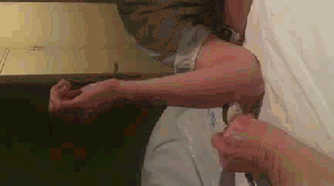 La posición del paciente es, situada frente al explorador, brazo en 90º del eje largo del húmero con el radio. Podemos hacer que apoye en algo para elevar el miembro estudiado, pero el ángulo en torno a 90º es prioritario. Vamos a pedirle, llegado el momento, que mueva la muñeca haciendo un giro haciendo un movimiento de rotación sobre el eje largo del radio, como si estuviésemos apretando una bombilla, como atornillando algo en el techo.