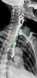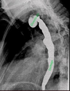 A la paciente se le realizó también un estudio esófago-gastroduodenal (EGD) para su diagnóstico. Se obtuvieron imágenes del esófago mientras que la paciente bebía contraste baritado, observándose el divertículo esofágico (KJ). Comenzamos el estudio en bipedestación (imágenes 6 y 7), después tomaremos imágenes en prono, imagen 8.