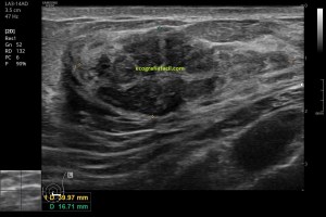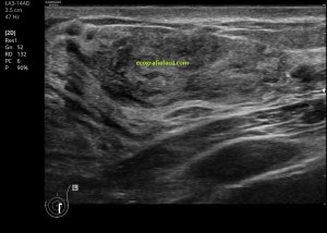 En esta imagen número 3 puedes ver la relación del hamartoma con el tejido glandular periférico, su ecogenicidad y su transmisión sónica, elementos muy importantes a la hora de poder reconocer una estructura potencialmente «fea».