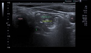 La sonda está en transversal al lóbulo tiroideo izquierdo. Se visualiza el esófago (E) y divertículo de Killiam-Jamieson.