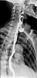 Imágenes en OPI en bipedestación donde se observa el paso de contraste por el esófago y una imagen sacular: divertículo esofágico