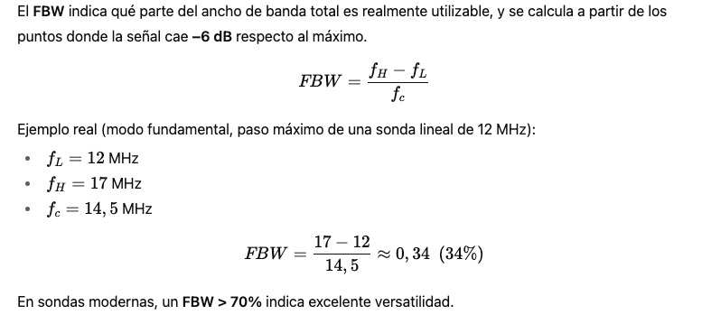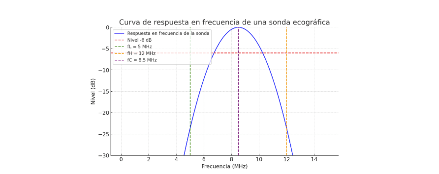 El ancho de banda (BW) es el rango de frecuencias en el que un transductor puede emitir y recibir señales útiles con calidad diagnóstica.
