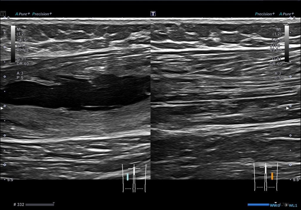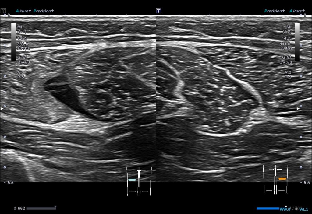 Finalmente, se le realizó una ecografía de la zona afectada, donde se observó una imagen ovalada, hipoecoica, sin signos de vascularidad. Inicialmente, esta imagen fue interpretada como un lipoma, dada su forma y apariencia. Sin embargo, tras revisar detalladamente la historia clínica de la paciente y conocer que el inicio de los síntomas ocurrió después de la vacunación, el radiólogo concluyó que era probable que este hallazgo se tratara de un efecto adverso causado por la inoculación de la vacuna.