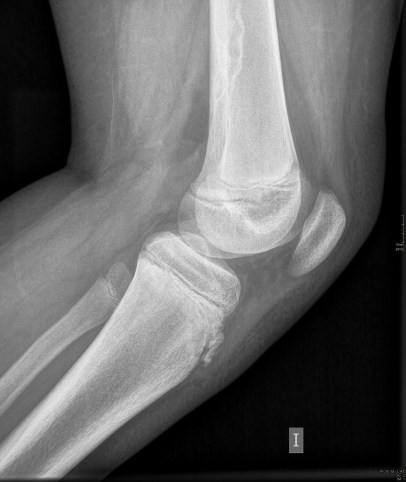 Cuando terminé la exploración y el radiólogo la chequeó le pidió al paciente unas placas para demostrar estos hallazgos, el resultado de las radiografías son estos, se aprecia perfectamente en la lateral los cambios o hallazgos que mostraba la ecografía MSK, mira: