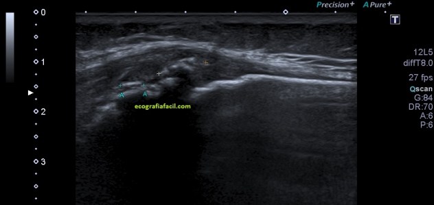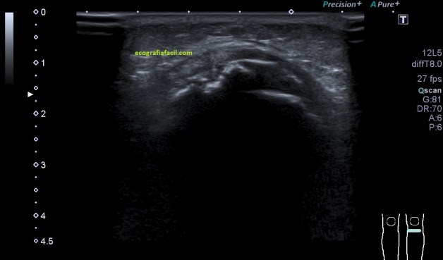La exploración es típica para el tendón rotuliano, te enlazo la exploración para que tengas base. Cuando el paciente empieza a contar la zona de dolor, el tipo de dolor que padece y colocamos el transductor en la zona de interés, observamos esto en el corte longitudinal a la altura de la inserción del rotuliano en la tibia.