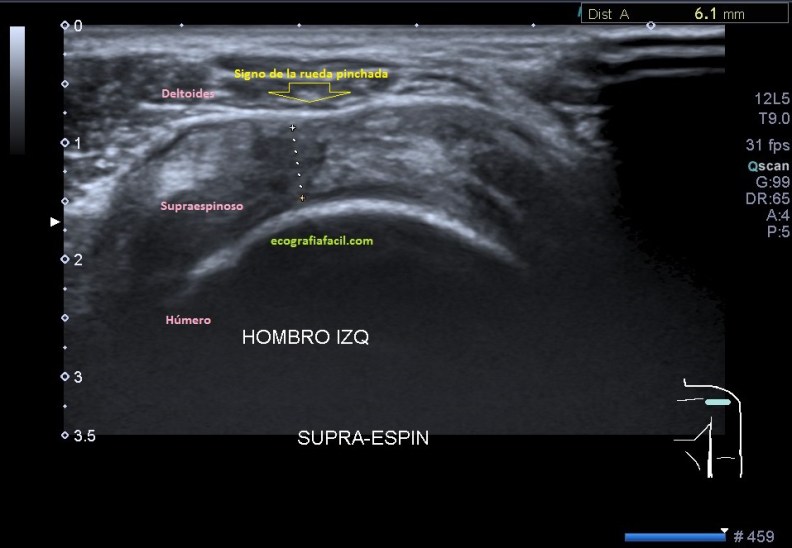 Existe un signo llamado «de la rueda pinchada», donde el tendón del supraespinoso está patológico, pierde su integridad y simula una rueda que ha pinchado, perdiendo esa relación de líneas paralelas curvas que viste arriba. Este signo lo encontrarás normalmente en la siguiente fase, de la que te explico ahora, pero también puedes encontrarlo en la rotura parcial, incluso, en ocasiones, puedes ver este signo y no ver roturas.