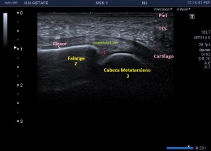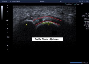 Anatómicamente la placa plantar es una estructura fibrocartilaginosa altamente resistente debido al colágeno tipo 1. Ecográficamente, está entre el flexor del dedo y la cabeza del metatarsiano y su aspecto es hiperecogénico, ocupando el espacio que va desde el cuello del metatarsiano hasta la porción distal y plantar de la falange articular con el metatarsiano. Imagen 3 y 4, normalidad ecográfica. Imagen 5, imagen patológica.