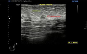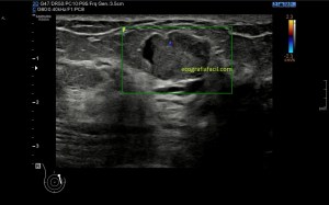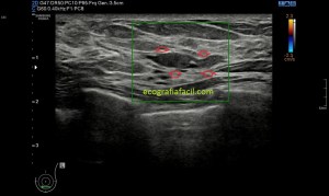 Cuando esa apariencia ecográfica del conducto no es anecoica y es hiperecogénica, es decir, cuando ese contenido es ecogénico debemos poner nuestras orejas de punta…tendremos que ver si ese contenido es móvil, es decir, si se mueve dentro del conducto, si es un conducto o varios y sobre todo, debemos estar muy atentas para ver si ese contenido que pudiera ocupar ese conducto es nodular, si así lo fuere podríamos estar delante de otra patología muy importante dentro de la ecografía de mama que es el Papiloma.