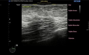 En la primera revisión tras cirugía nos encontramos una lesión cicatricial con una moderada cantidad de líquido de aspecto hipoecogénico, es irregular, la paciente tenía molestia en la zona, pero no presentaba fiebre.