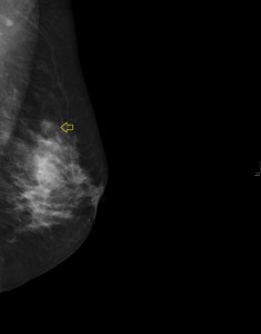 En el caso que te presento hoy, una mujer, que se realiza una revisión ecográfica mamaria por seguimiento de una lesión nodular en la mama izquierda a expensas de una mamografía, imagen 1, donde se observa en cuadrantes superiores una lesión nodular marcada con flecha amarilla.