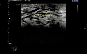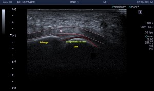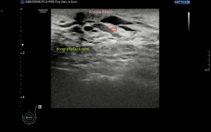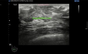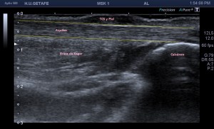 Si sabemos que la estructura es de una intensidad ecogénica alta, la aparición de focos hipoecogénicos en el lugar pueden ser constitutivos de lesión locoregional, temerosos siempre de la anisotropía, aunque no es una anatomía tendinosa, la colocación de la sonda no es fácil por la orografía de la zona y por tanto, siempre con las orejas de punta…y gel, usamos mucho gel para que el apoyo sea perfecto. Te he dicho anteriormente que la rotura de esta estructura puede acarrear a presencia de líquido que se verá anecoico en la zona.