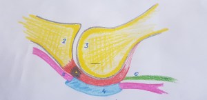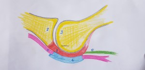 Para mi entender la anatomía me resultó vital, para luego poder correlacionar con la ecoarquitectura…en la imagen 1 puedes ver un dibujo, lo siento, no soy Monet como muy bien puedes comprobar, pero espero que te sirva para que entiendas como es la anatomía, superbásica, de un corte sagital de una metatarsiano en la articulación de la cabeza del metatarsiano (3) con la falange proximal (2) y su relación con la placa plantar (1), en rojo, el tendón flexor del dedo que estemos estudiando (5), en rosa, y la vaina que lo rodea (4), en azul…imposible olvidarme del verde, es la fascia plantar y es el número 6.