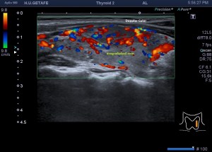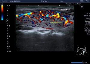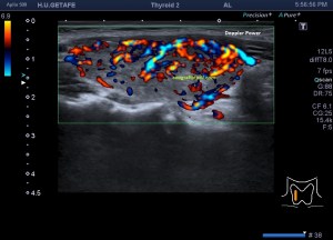 En la exploración objetivamos una glándula tiroidea aumentada de tamaño, sin imágenes nodulares, pero si heterógenea toda ella con afectación global en ambos lóbulos tiroideos. Semiológicamente se observa una y/o hiperplasia glandular y es muy significativo un abombamiento anterior de la glándula, con unas medidas elevadas discretamente respecto de sus medidas en rango de normalidad, es decir, la paciente tiene bocio no nodular y además alteración en la ecogenicidad de la glándula, pero lo más llamativo fue cuando puse el doppler para estudiar la vascularización de ambos lóbulos tiroideos. Era una vascularización elevada, mucho más que la normal vascularización de esta glándula. Es el conocido Infierno Tiroideo.