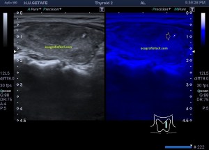 Una de la exploraciones que más realizamos en ecografía son aquellas que van dirigidas al tiroides, con el objetivo habitualmente de estudiar posibles nódulos. La enfermedad nodular tiroidea es muy habitual, pero también nos encontramos asíduamente tiroides cuya afectación es difusa, es decir, no existen nódulos, pero la glandula está afectada de modo global.
