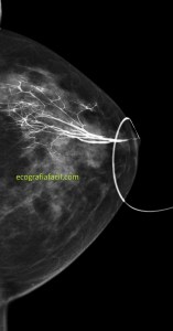 He comentado antes que en ocasiones se le puede realizar a una paciente una galactografía, sobre todo cuando la secreción es por un solo conducto, y además sanguinolenta, pero es decisión de las doctoras, como ya he comentado. Esta prueba es la Galactografía, antes era muy habitual su realización, cada día más en desuso, te dejo la imagen 9 para que aprecies la belleza de esta técnica donde se usa un contraste que se inyecta previa canalización del agujero correspondiente al conducto que tiene la secreción, usando el mamógrafo para esta técnica.
