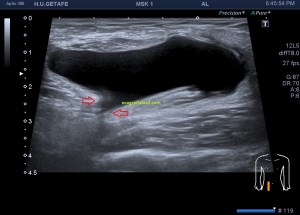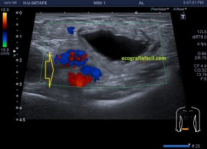 En cuanto localicé este hallazgo realicé corte transverso (imagen 2) y longitudinal (imagen 1), con medidas y estudio en modo doppler para ver vascularización (imagen 3, flecha amarilla), seguidamente, era muy importante asegurar algunas referencias locoregionales como los grandes vasos femorales, siempre debemos documentar esta coexistencia y buscar un cuello que puedes observar con las dos flechas rojas de la imagen 1 y que la ecoestructura marca perfectamente al ser anecoica.