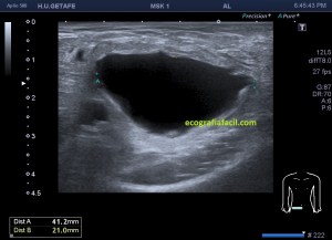 Aunque no muchas, ya había visto alguna vez esta entidad y sabía que era un Quiste de Nuck, pero necesitaba buscar los hallazgos anatómico ecográficos previamente comentados, como la localización junto a los grandes vasos y el cuello, para poder presentarlo a la radióloga para que realizase el informe, que corroboró lo que pensaba, lo cual no tiene relevancia alguna. Esta patología puede ser conocida también como Hidrocele de Nuck.