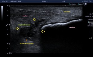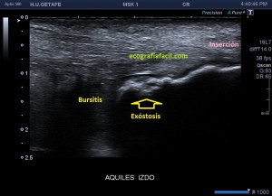 En muchas ocasiones vamos a encontrar calcificaciones de inserción o entensopatías, pero ver ecográficamente la afectación de la bursa es mucho menor. En muchas ocasiones, la radióloga necesita ampliaciones de estudio con radiología simple y con RMN para poder efectuar convenientemente este diagnóstico y nosotros, tenemos que ser muy minuciosos en la exploración ecográfica de esta región, conocer perfectamente ecoarquitectura normal de la región para poder identificar tanto los calcios insercionales como la bursitis retroaquílea, amén de la tendinopatía, ni que decir tiene a complicaciones tendinosas derivadas de estado avanzados de la patología como pudieran ser la roturas insercionales, parciales o totales.