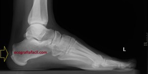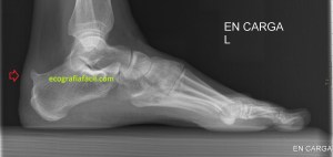 La flecha amarilla indica la que en la parte posterior del calcáneo existe un calcio tosco en esta rx lateral del pie en carga, pero es en la inserción, cuidado con esto, cuando se produce el Haglund, no es en la inserción, es antes, y se debe a la exostosis mencionada con anterioridad, mira, compara imagen 12 e imagen 13. La flecha roja es indicativa de Síndrome de Haglund.