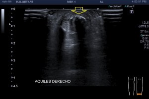 El paciente nos comenta que había sido futbolista, que había padecido lesiones en la región que estábamos estudiando. Me sirvió de mucha ayuda su comentario, porque estaba viendo que ademas de los hallazgos comentados el aquiles estaba muy engrosado , típico de tendinopatía, pero es esa misma localización, las fibras más superficiales del tendón estaban retraídas y mostraban un pequeño muñón que estaba en relación con una lesión antigua puesto que no tenía dolor agudo ni líquido.