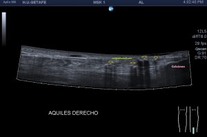 El paciente en cuestión tenía una exploración que al poco de empezar me llamó la atención porque en la zona de máximo dolor referido por el paciente, encontré unas imágenes hiperecogénicas, redondeadas, pero irregulares, de multitud de tamaños distribuidas aleatoriamente a lo largo del tendón y que dejaban sombra acústica posterior, siendo más evidentes a unos cinco centímetros de la inserción calcánea.