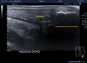 La aparición de estas calcificaciones me llevó a pensar que la presencia de calcio pudiese corresponder a avulsiones de materíal óseo correspondiente al calcáneo, es decir, roturas del Aquiles con arrancamiento de la inserción del hueso. En muchas ocasiones el tendón de aquiles calcifica en su inserción, normalmente son calcificaciones lineales que están en relación con tendinopatías de inserción, entensopatías, pero en ocasiones estas calcificaciones son muy evidentes, y existe cambios que tanto ecográficamente como físicamente afectan a esta la región y pueden aparecer bultomas y enrojecimiento de la zona, en relación con el síndrome de Haglund.