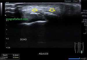 El Aquiles es el tendón de los gemelos y el sóleo que inserta en la cara posterior de la pierna, en el calcáneo. Sus fibras son alargadas, es un tendón muy potente, muy superficial, ecogénico, superficial a la grasa de Kager.