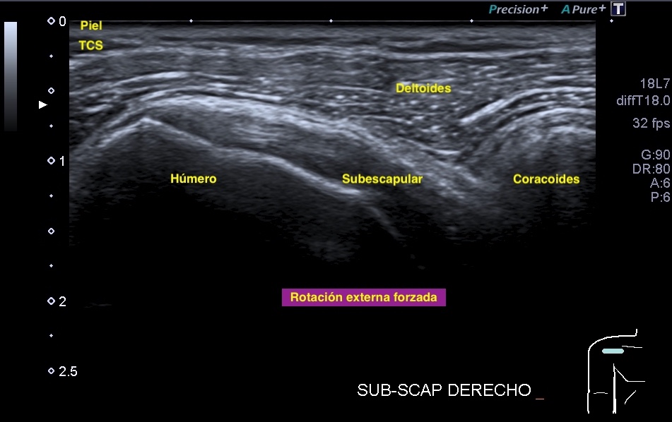 Tendón del Subescapular: En la ecografía, el tendón del subescapular se visualiza como una estructura fibrilar hiperecoica (brillante) que se extiende desde la escápula hasta la tuberosidad menor del húmero. Se evalúa su grosor, integridad y presencia de cambios patológicos, como tendinopatía o desgarros.