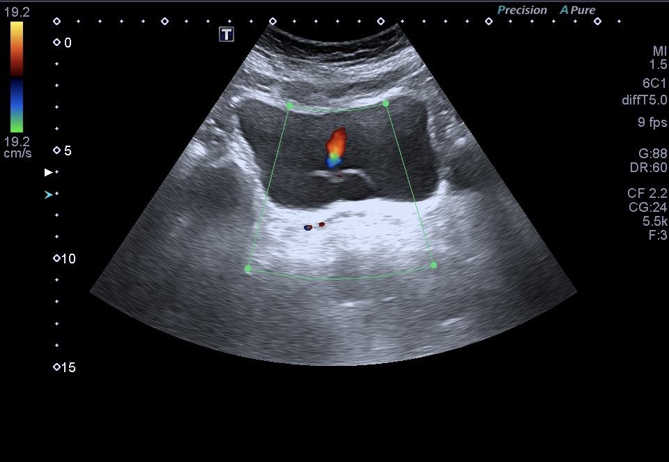 Ureterocele visible: Los ureteroceles pueden verse en la ecografía como pequeñas bolsas o sacos en la entrada de los uréteres en la vejiga de aspecto anecoico e incluso móviles. El Jet vesical estará desplazado.