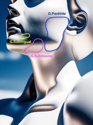 En el cuello encontramos tres tipos de glándulas salivares. De fuera hace adentro, tenemos parótida, submaxilar y sublinguales.