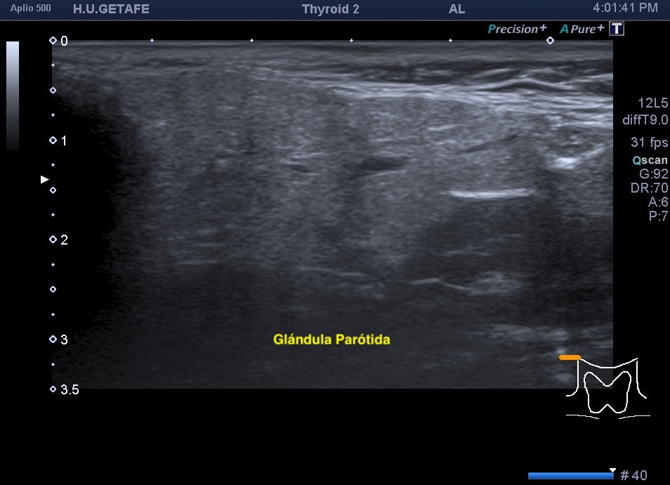 Ecogénicamente las tres glándulas se ven hiperecogénicas y homogéneas, la parótida es la más compleja por su ecogenicidad, y su acceso al lóbulo profundo, siempre se vé peor que las demás.