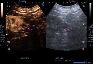 Por ejemplo en algunas patologías es muy útil el cambio de frecuencias, por ejemplo en los hígados con Esteatosis Hepática donde no se observa bien los planos más profundos del órgano afectado. En la imagen siguiente podemos ver como disminuyendo la frecuencia ganamos poder de penetración pudiéndose observar en la profundidad con más claridad la interfase producida por el diafragma (línea blanca hiperecogénica o brillante).
