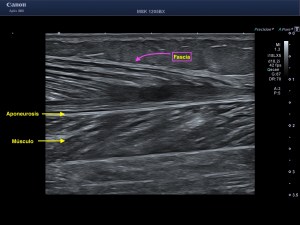 2. Aponeurosis:La aponeurosis es una membrana fibrosa formada principalmente por haces de colágeno que son hiperecogénicos y que tiene la función de servir de inserción a algunos músculos.
