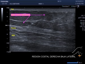 8. Tejido Celular Subcutáneo:La grasa subcutánea distribuida por toda la anatomía. Compuesta de lobulillos, hipoecogénicos separados por tejido conectivo paralelos a la piel que son hiperecogénicos.