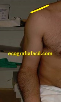 Tenemos que colocar a la/el paciente de espaldas, pedirle que lleve la mano del hombro a estudio a tocar el otro hombro sin despegar el brazo del torso, ojo con las pacientes con volumen mamario elevado.