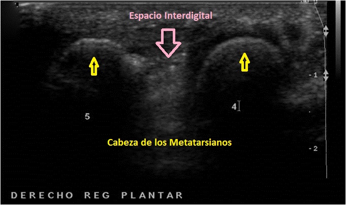 Ecographically is a very delicate study to execute, arduous, technical and anatomical knowledge of the area is required, the two regions of the toes are explored, both the Plantar (the most important) and the Dorsal, in transverse and longitudinal , meticulously studying the heads of the metatarsals and the interdigital spaces, where this type of benign tumors can appear.