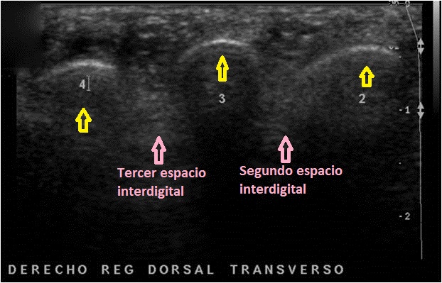 En los cortes en la zona dorsal buscaremos los espacios interdigitales y valoraremos las cabezas de los metatarsianos y sus articulaciones regionales para buscar patología en dichas articulaciones.
